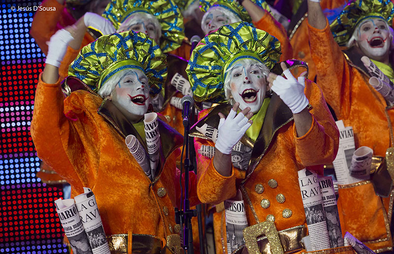 JOCIKUDOS .- Agradable actuación. Sonaron mucho mejor que el año pasado desde su “Bienvenidos”. “El informativo” fue una canción ordenada con muchos asuntos, unos más acertados que otros: los niños, la pobreza o “Paulino que lo boten en la cárcel”. En la segunda intentaron rendir homenaje a Guachi. Y ahí, en la endogamia, acabaron sus aspiraciones de final. Bien cantado, mejor hubiera sido mandar un mensaje de voz a otros murgueros para decirles lo que piensan de ellos cuando van a La Noria y pontifican de Carnaval. Despedida a ritmo de caja, bombo y platillo. La niña que acompañó al director, todo un espectáculo.